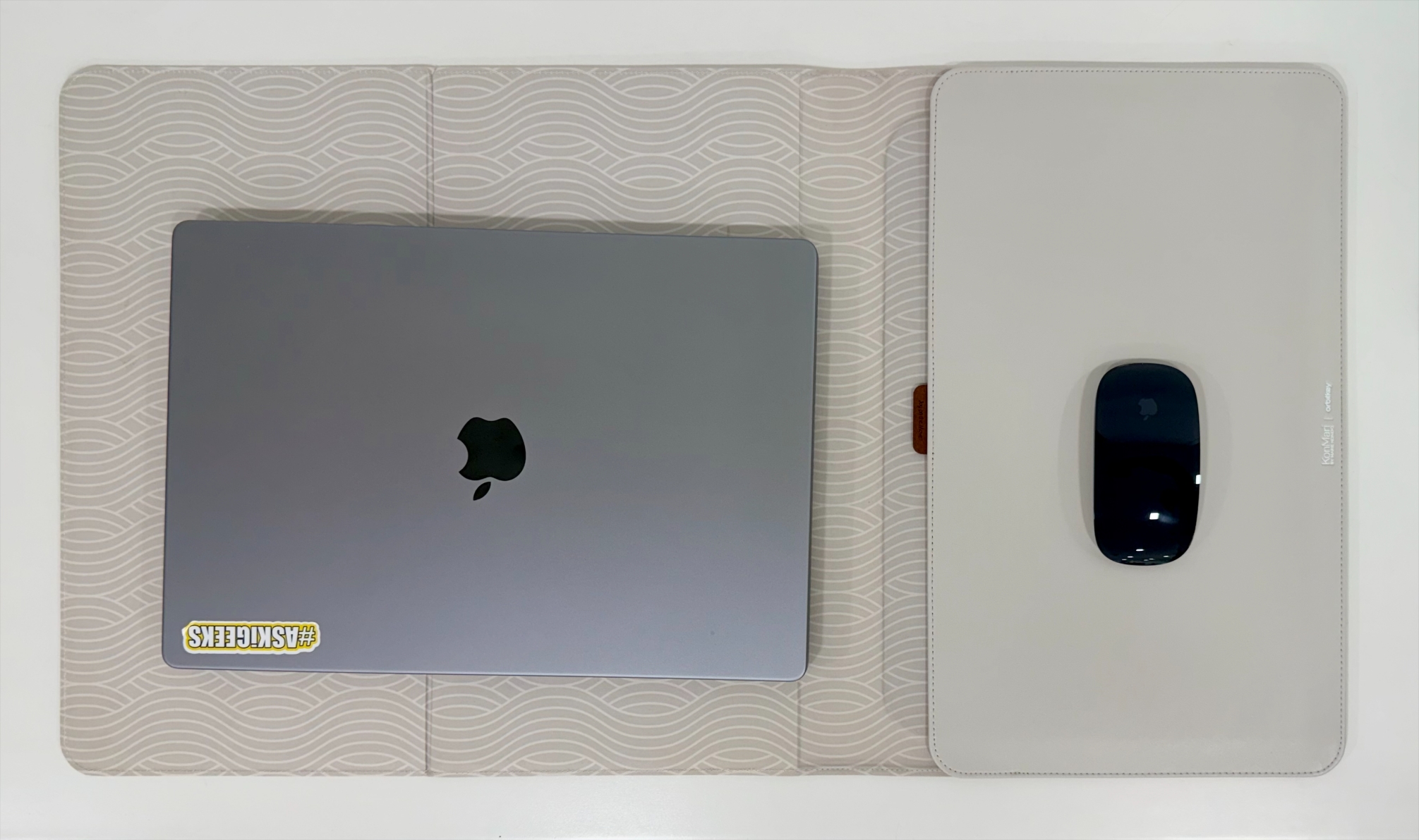The outer surface combines smooth vegan leather with recycled woven fabric. It feels premium, and although we expected it to attract dust and stains, especially since it only comes in a light Stone color, that was not the case. The magnetic closure clicks quietly into place, keeping the sleeve clean and easy to use without zippers or clasps. You can even charge your laptop while it’s inside, which turned out to be surprisingly convenient. Inside, there’s a subtle Sashiko wave pattern, a nice nod to Japanese design that connects back to the KonMari idea of mindfulness.
